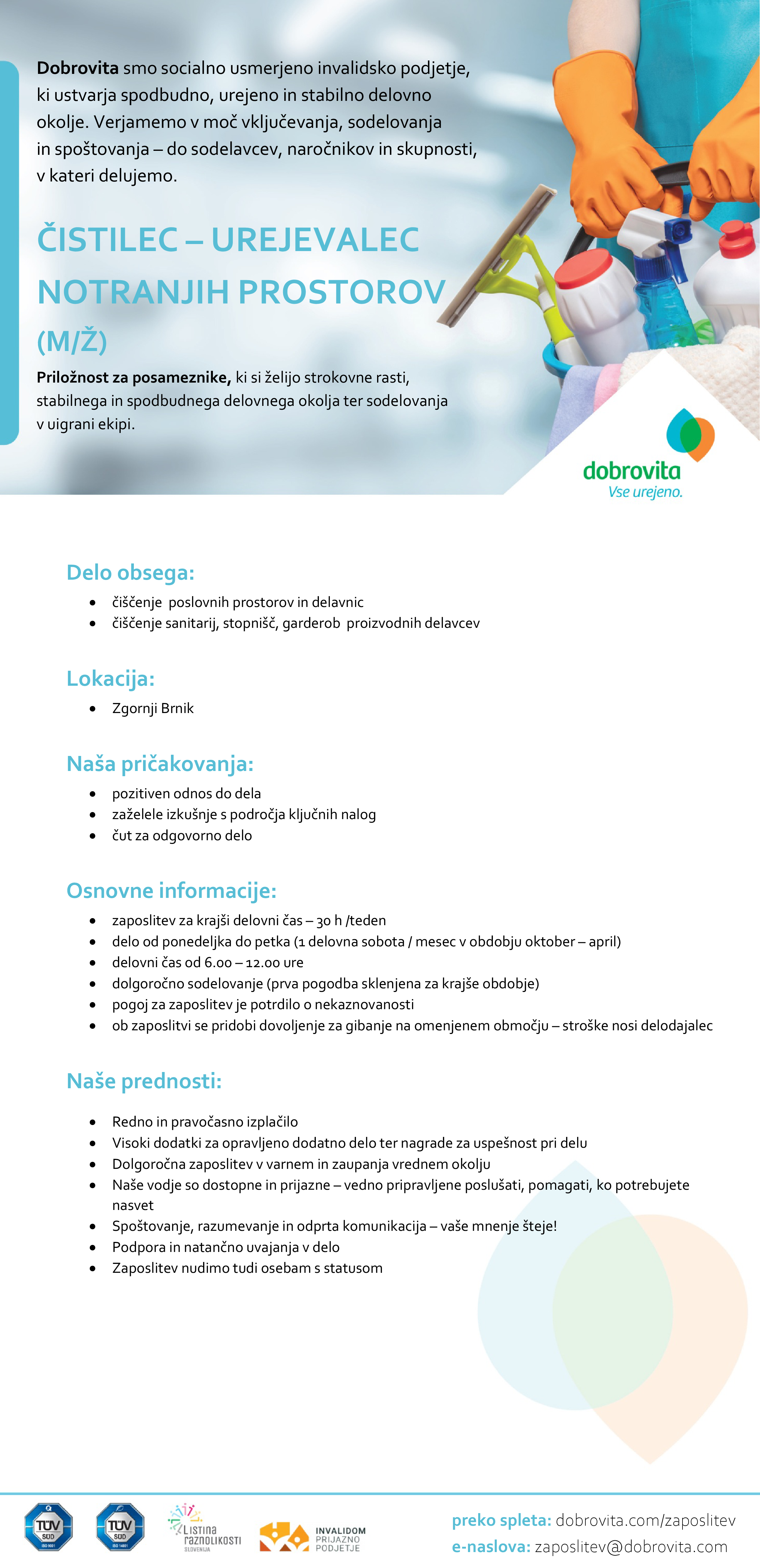 Čistilec - urejevalec notranjih prostorov (m/ž), Zgornji Brnik