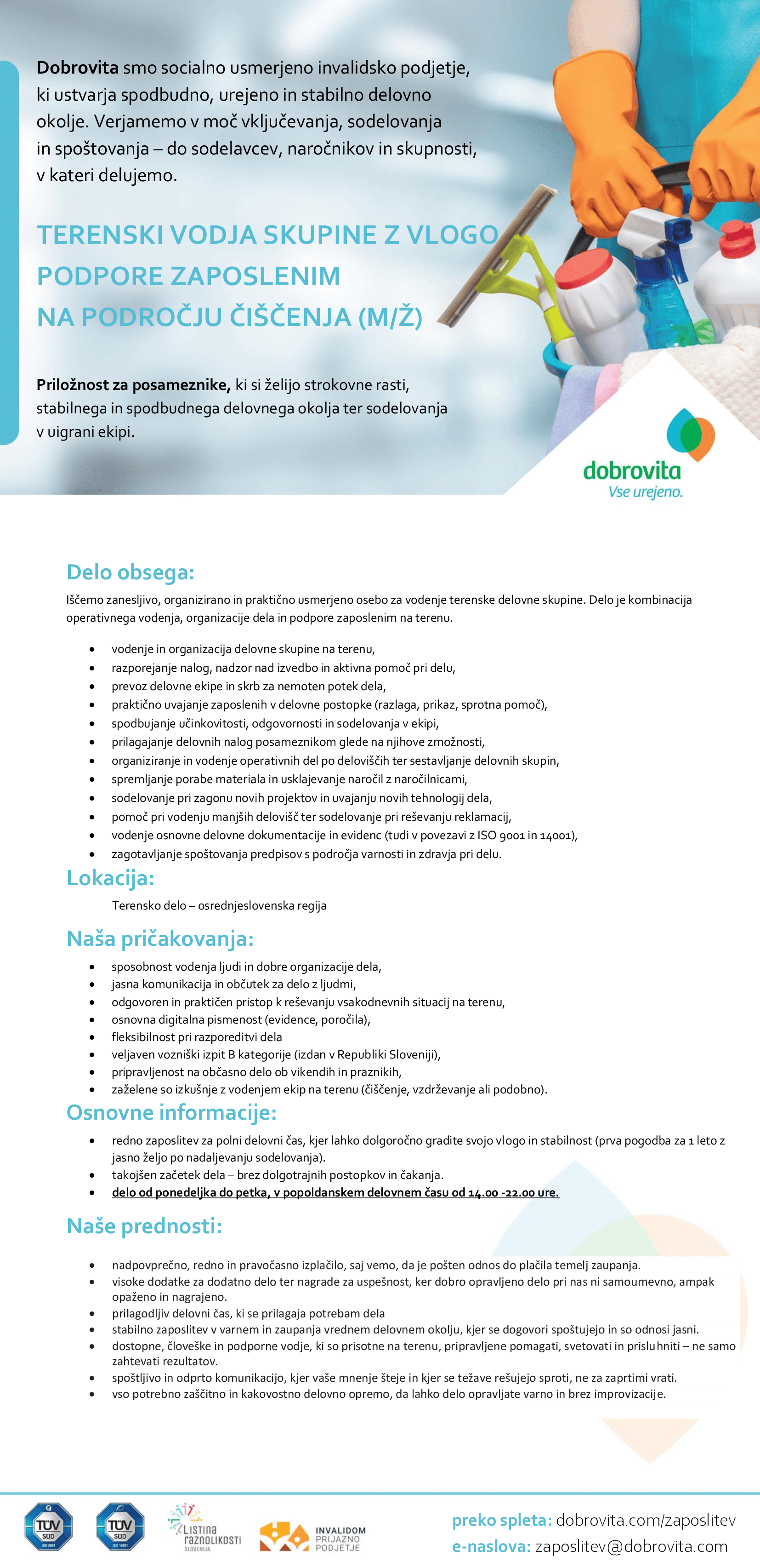 Vaša prijava za delovno mesto Terenski vodja skupine z vlogo podpore zaposlenim na področju čiščenja je uspešno oddana.